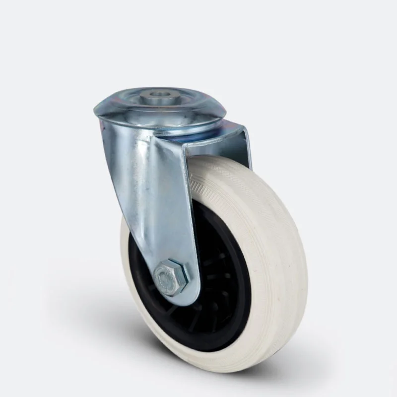 Preslenmiş çelik saç, beyaz çinko kaplama, çift bilya yataklı, döner başlık, plastik toz koruması, civata ve somunlu teker aksı