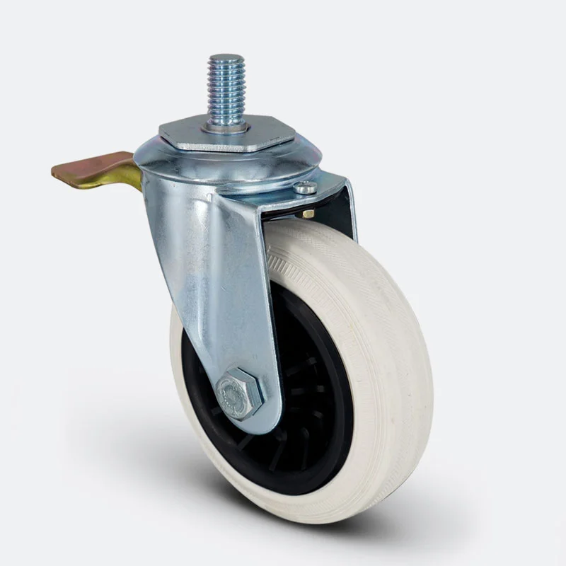 Preslenmiş çelik saç, beyaz çinko kaplama, çift bilya yataklı, döner başlık, plastik toz koruması, civata ve somunlu teker aksı