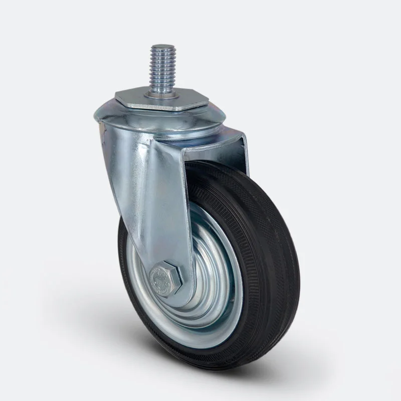Preslenmiş çelik saç, beyaz çinko kaplama, çift bilya yataklı, döner başlık, plastik toz koruması, civata ve somunlu teker aksı
