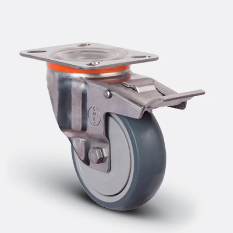 Preslenmiş paslanmaz çelik saç, çift bilya yataklı, döner başlık, plastik toz koruması, civata ve somunlu teker aksı
