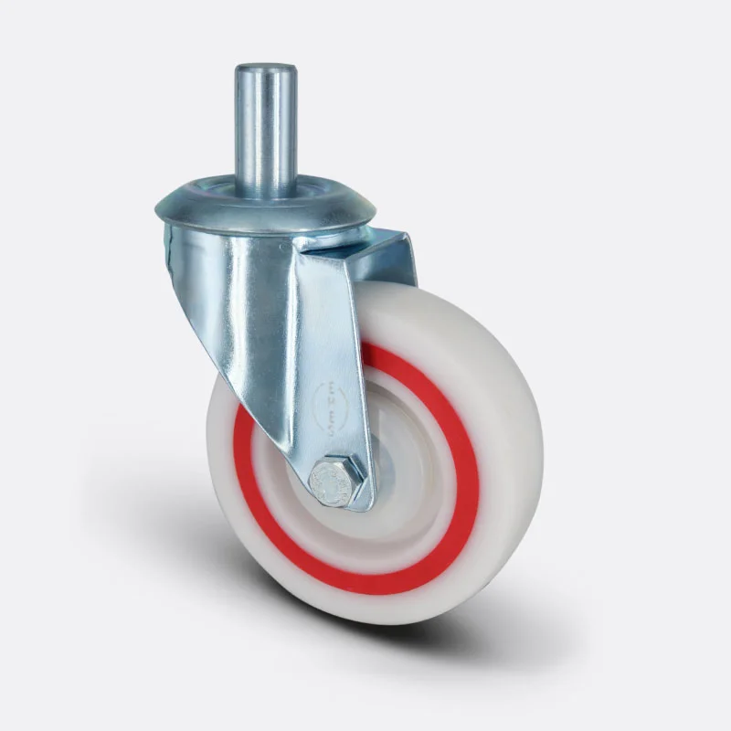 Preslenmiş çelik saç, beyaz çinko kaplama, çift bilya yataklı, döner başlık, plastik toz koruması, cıvata ve somunlu teker aksı