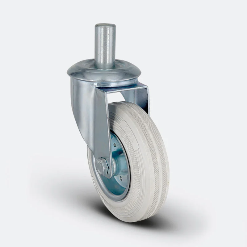 Preslenmiş çelik saç kasnak, gri kauçuk, iz bırakmaz (85 Shore A), jant kapaksız, masura rulman yataklı