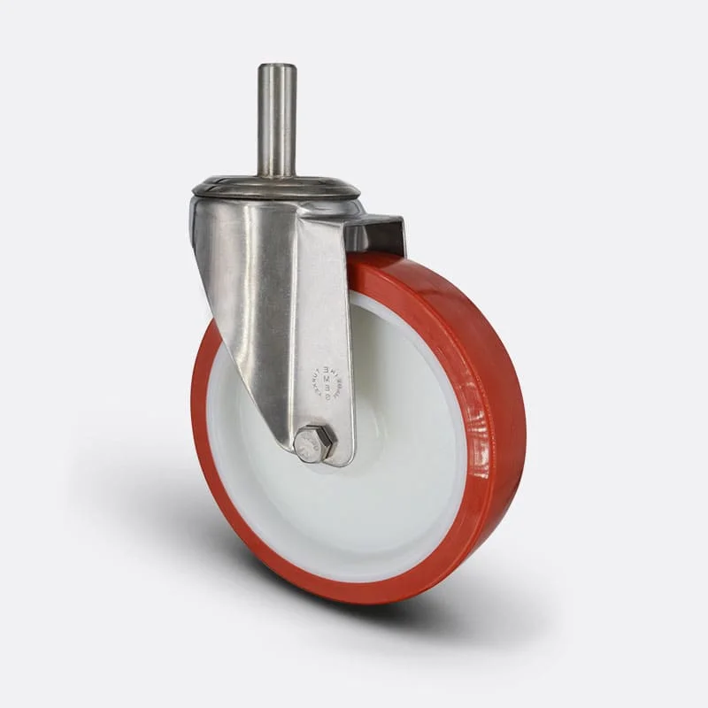Preslenmiş paslanmaz çelik saç, çift bilya yataklı, döner başlık, plastik toz koruması, civata ve somunlu teker aksı