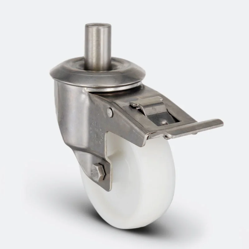 Preslenmiş paslanmaz çelik saç, çift bilya yataklı, döner başlık, plastik toz koruması, cıvata ve somunlu teker aksı