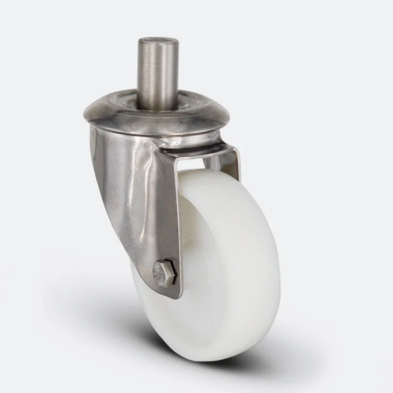 Preslenmiş paslanmaz çelik saç, çift bilya yataklı, döner başlık, plastik toz koruması, cıvata ve somunlu teker aksı