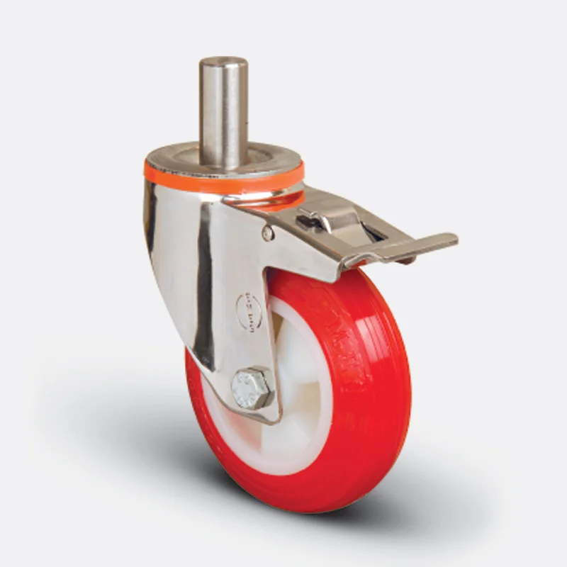Preslenmiş paslanmaz çelik saç, çift bilya yataklı, döner başlık, plastik toz koruması, civata ve somunlu teker aksı