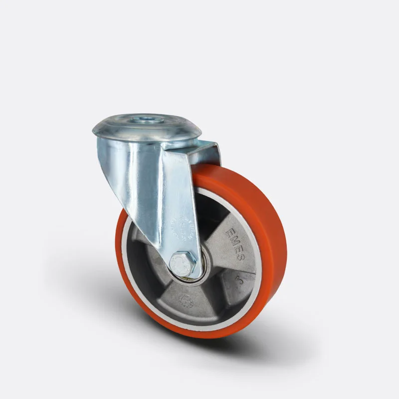 Preslenmiş çelik saç, beyaz çinko kaplama, çift bilya yataklı, döner başlık, plastik toz koruması, cıvata ve somunlu teker aksı