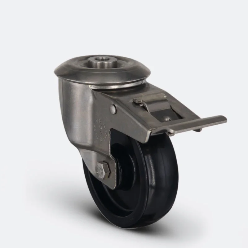 Preslenmiş paslanmaz çelik saç, çift bilya yataklı, döner başlık, civata ve somunlu teker aksı