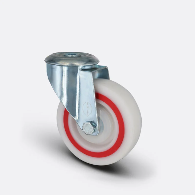Preslenmiş çelik saç, beyaz çinko kaplama, çift bilya yataklı, döner başlık, plastik toz koruması, cıvata ve somunlu teker aksı