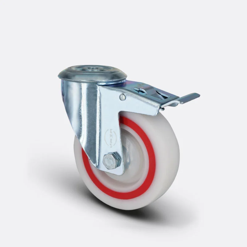 Preslenmiş çelik saç, beyaz çinko kaplama, çift bilya yataklı, döner başlık, plastik toz koruması, cıvata ve somunlu teker aksı