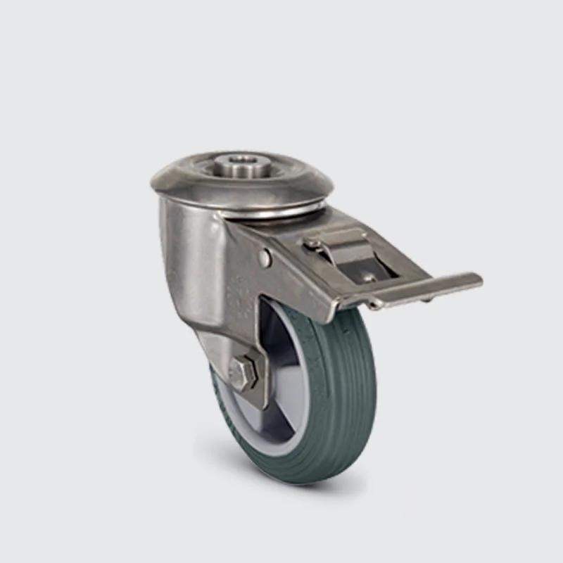 Preslenmiş çelik saç, beyaz çinko kaplama, çift bilya yataklı, döner baslık, plastik toz koruması, cıvata ve somunlu teker aksı