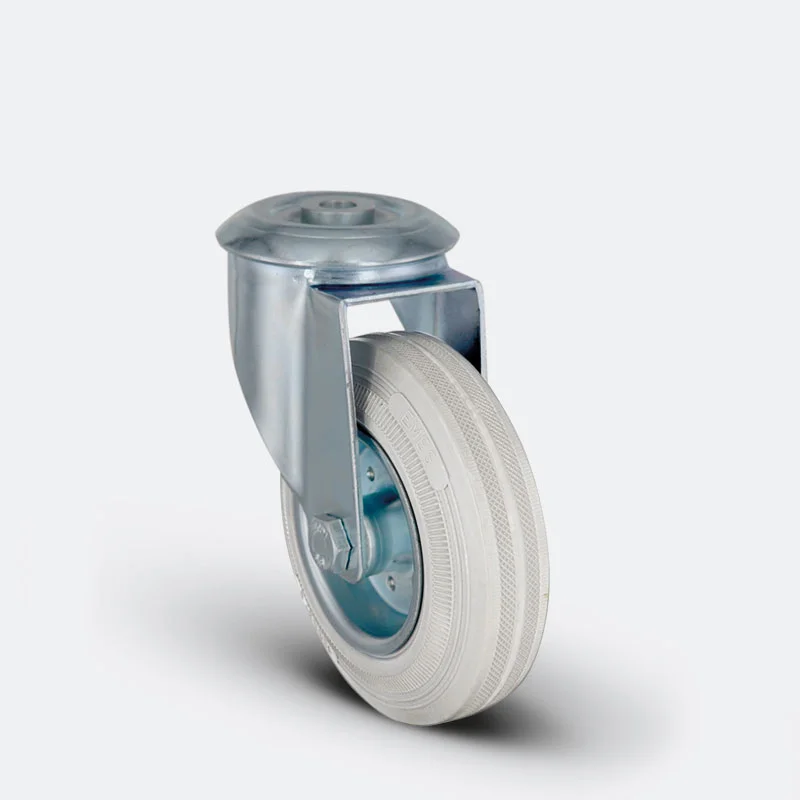 Preslenmiş çelik saç kasnak, gri kauçuk, iz bırakmaz (85 Shore A), jant kapaksız, masura rulman yataklı