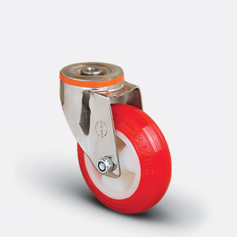Preslenmiş paslanmaz çelik saç, çift bilya yataklı, döner başlık, plastik toz koruması, civata ve somunlu teker aksı