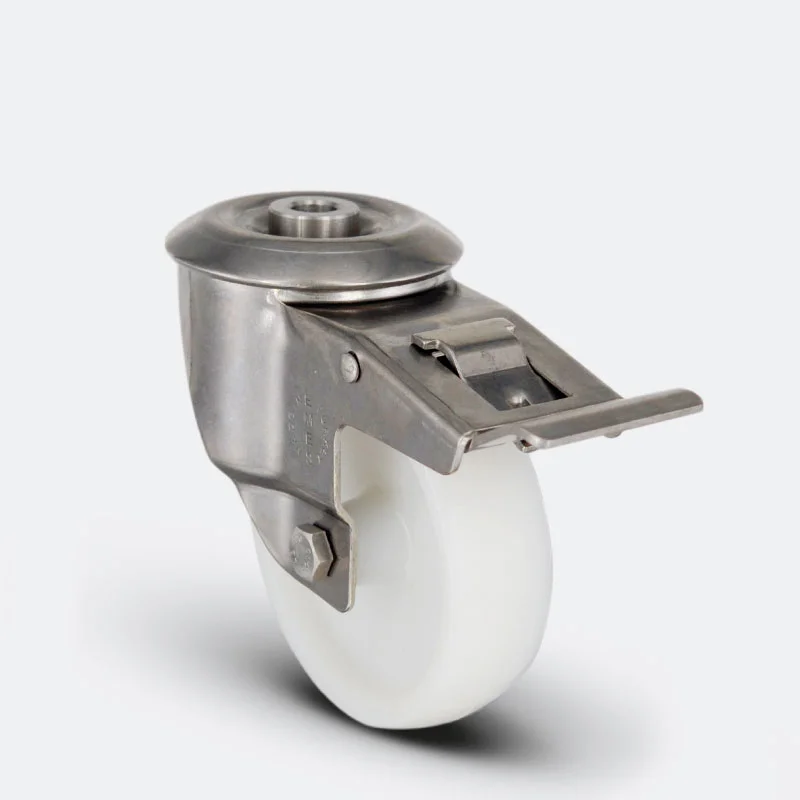 Preslenmiş paslanmaz çelik saç, çift bilya yataklı, döner başlık, plastik toz koruması, cıvata ve somunlu teker aksı
