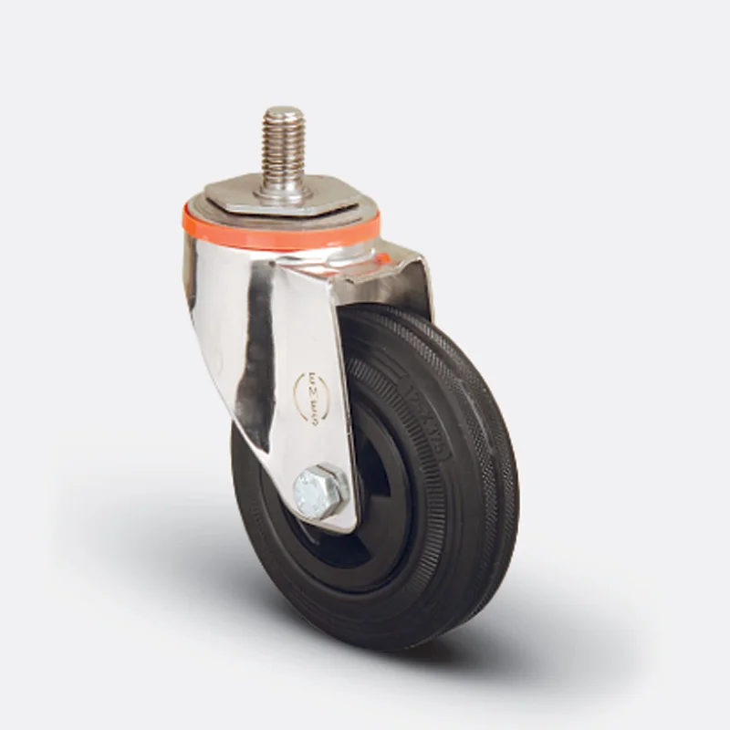 Preslenmiş paslanmaz çelik saç, çift bilya yataklı, döner başlık, plastik toz koruması, civata ve somunlu teker aksı