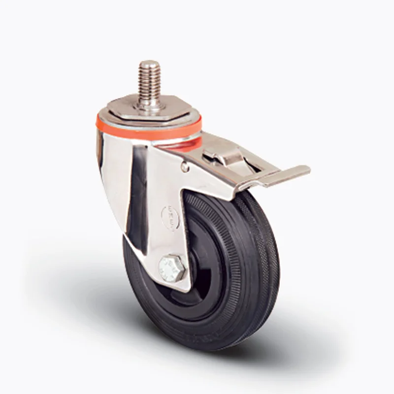 Preslenmiş paslanmaz çelik saç, çift bilya yataklı, döner başlık, plastik toz koruması, civata ve somunlu teker aksı