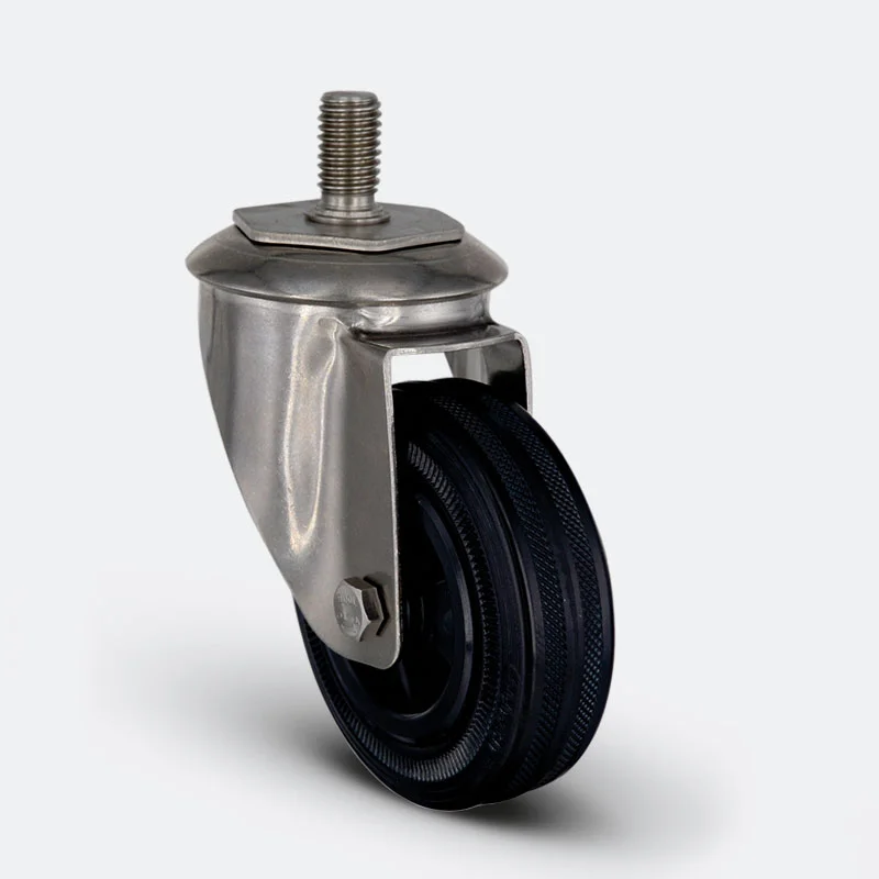 Preslenmiş paslanmaz çelik saç, çift bilya yataklı, döner başlık, plastik toz koruması, civata ve somunlu teker aksı