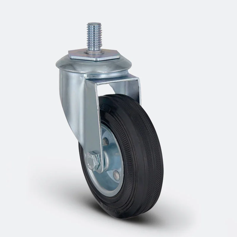 Çelik sac’dan preslenmiş mavi pasifize edilmiş çinko kaplama, jant yanakları perçin yardımı ile birleştirilmiş masura rulman yataklı, siyah kauçuk lastikten teker, 82+3 Shore A / -20°C+60°C