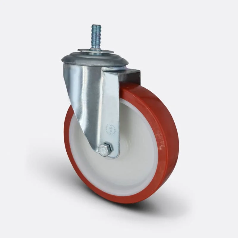 Preslenmiş çelik saç, beyaz çinko kaplama, çift bilya yataklı, döner başlık, plastik toz koruması, cıvata ve somunlu teker aksı