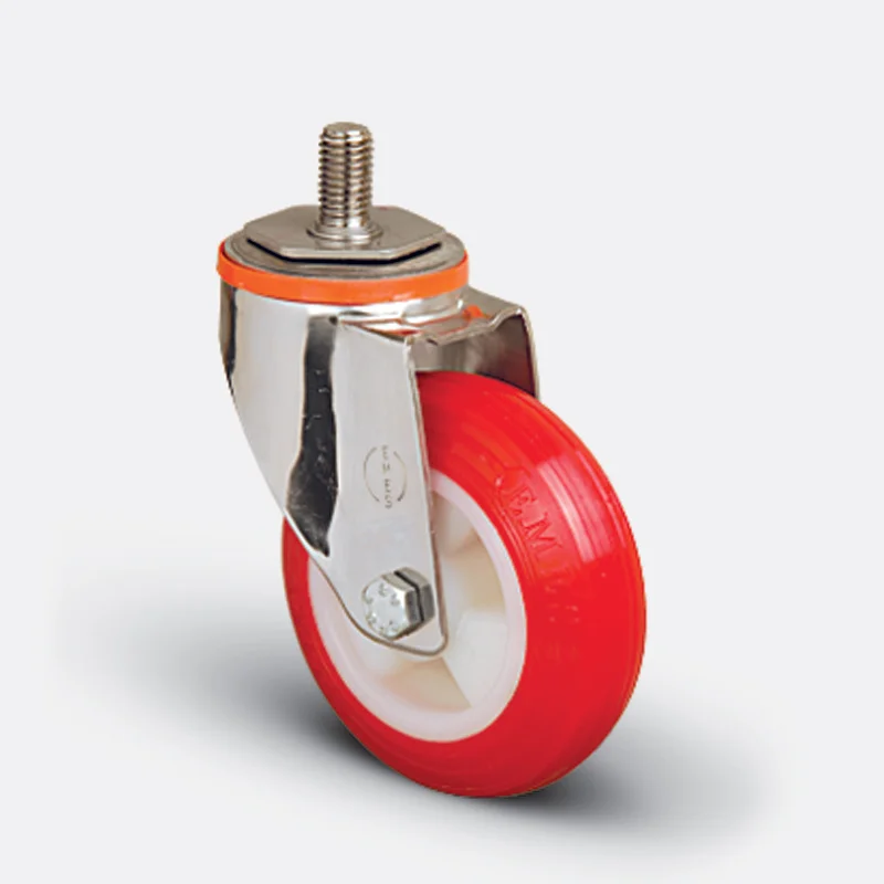 Preslenmiş paslanmaz çelik saç, çift bilya yataklı, döner başlık, plastik toz koruması, civata ve somunlu teker aksı
