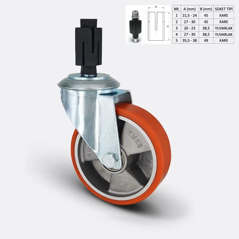 Preslenmiş çelik saç, beyaz çinko kaplama, çift bilya yataklı, döner başlık, plastik toz koruması, cıvata ve somunlu teker aksı