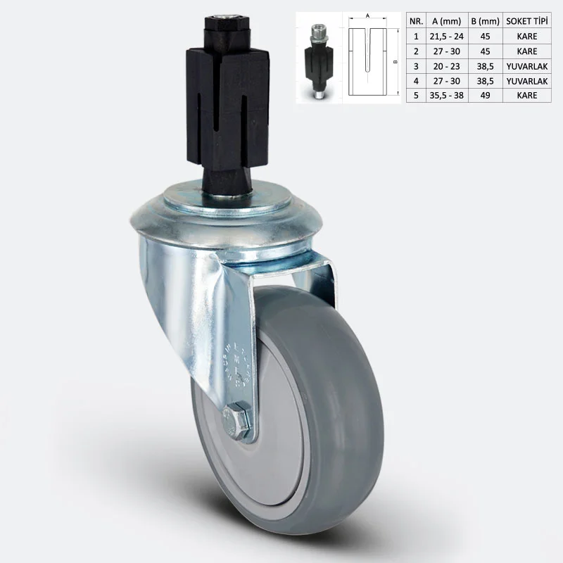 Preslenmiş çelik saç, beyaz çinko kaplama, çift bilya yataklı, döner başlık, plastik toz koruması, cıvata ve somunlu teker aksı