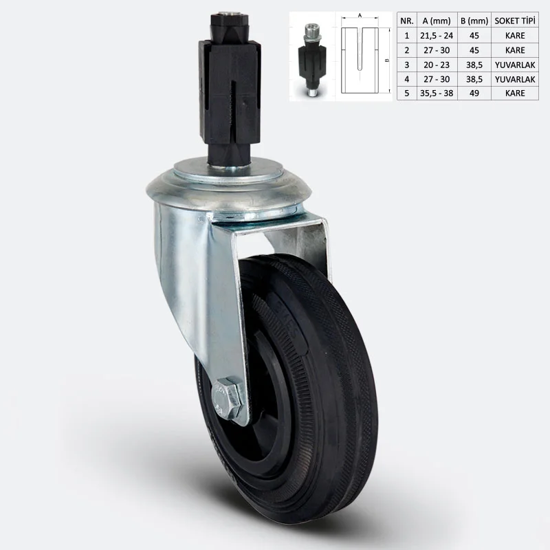 Çelik Sac'dan preslenmiş parçalar mavi pasifize edilmiş çinko kaplama, Çift dizme bilya yataklı döner aksam, Plastik toz koruması, Döner başlık ile uyumlu bağlantı çeşitleri (03-04-05-07), Maşa ve tekeri aynı anda kilitleyen fren sistemi, Boru montajlı teker aksı, Tablalı maşalar ile eşleşen çelik sac'dan işlenmiş sabit maşa.