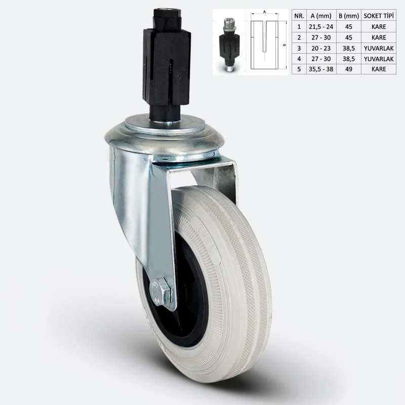 Çelik Sac'dan preslenmiş parçalar mavi pasifize edilmiş çinko kaplama, Çift dizme bilya yataklı döner aksam, Plastik toz koruması, Döner başlık ile uyumlu bağlantı çeşitleri (03-04-05-07), Maşa ve tekeri aynı anda kilitleyen fren sistemi, Boru montajlı teker aksı, Tablalı maşalar ile eşleşen çelik sac'dan işlenmiş sabit maşa.
