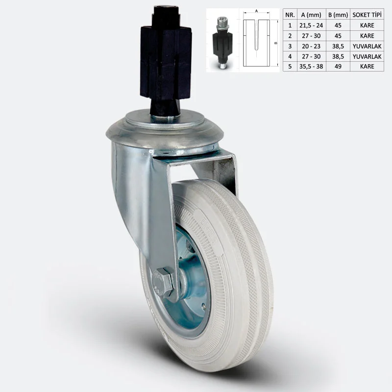 Preslenmiş çelik saç, beyaz çinko kaplama, çift bilya yataklı, döner başlık, plastik toz koruması, cıvata ve somunlu teker aksı
