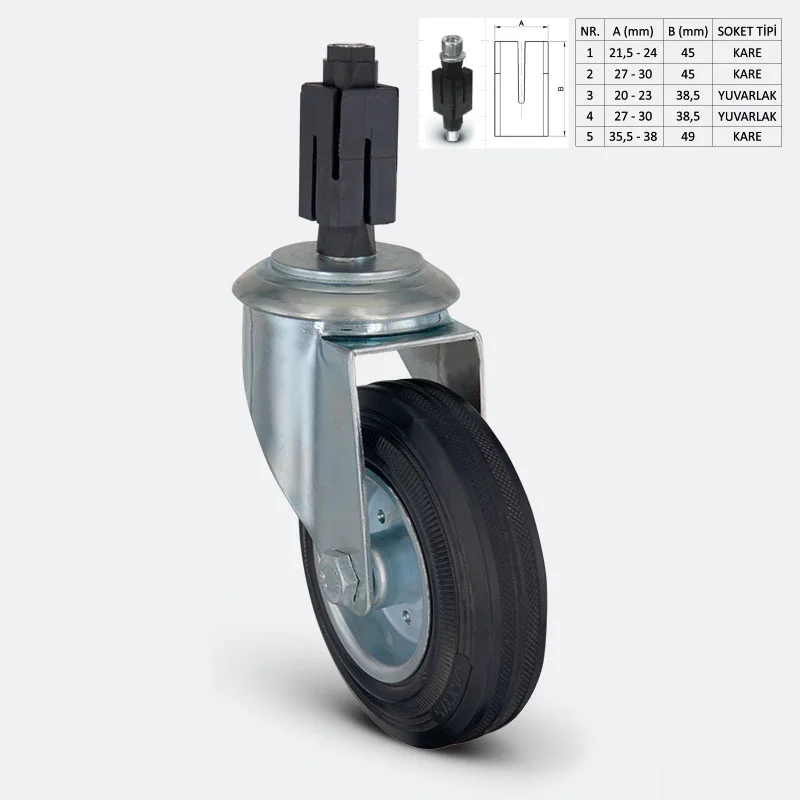Çelik sacdan mavi pasifize edilmiş çinko kaplama, Jant yanakları perçin yardımı ile birleştirilmiş poliamid burç yataklı siyah kauçuk lastikten teker, 82+3 Shore A / -20°C+60°C