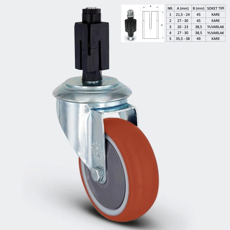 Preslenmiş çelik saç, beyaz çinko kaplama, çift bilya yataklı, döner başlık, plastik toz koruması, cıvata ve somunlu teker aksı