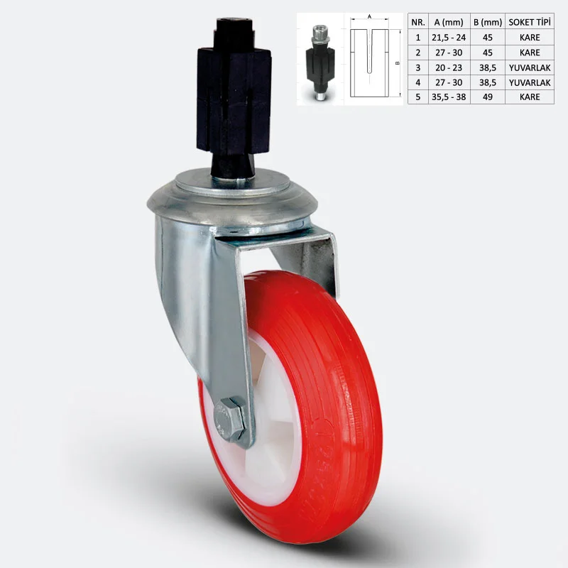 Preslenmiş çelik saç, beyaz çinko kaplama, çift bilya yataklı, döner başlık, plastik toz koruması, cıvata ve somunlu teker aksı