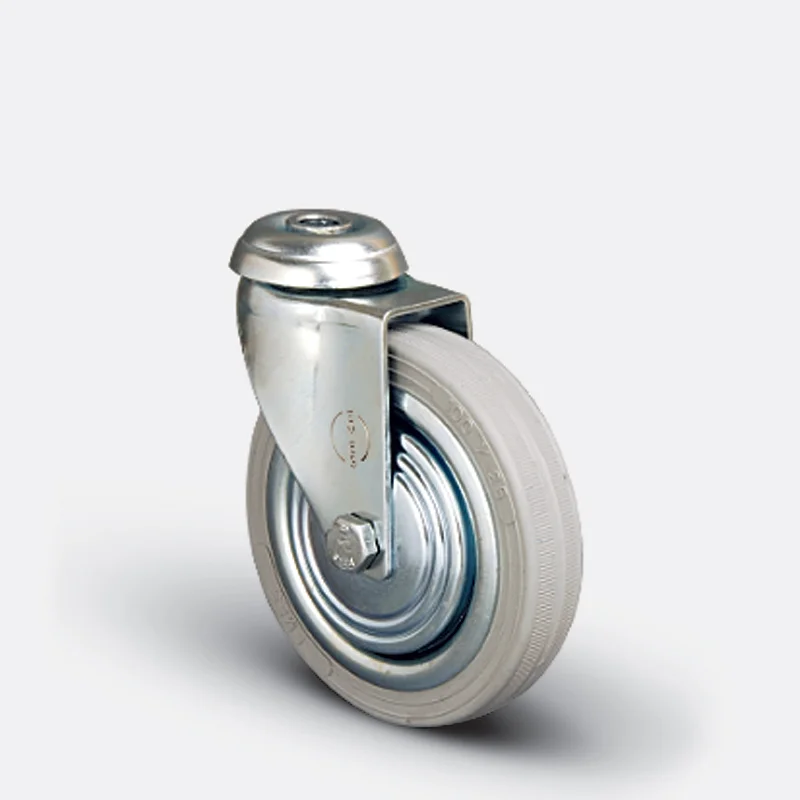 Preslenmiş çelik saç kasnak, gri kauçuk, iz bırakmaz (85 Shore A), jant kapaklı, masura rulman yataklı