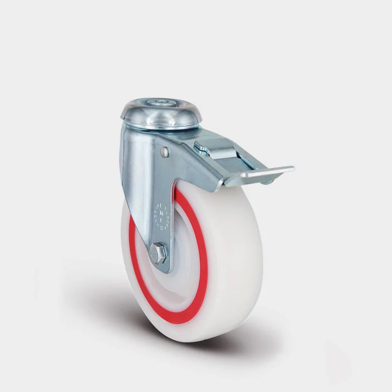 Preslenmiş çelik sac, beyaz çinko kaplama, çift bilya yataklı, döner başlık, civata ve somunlu teker aksı