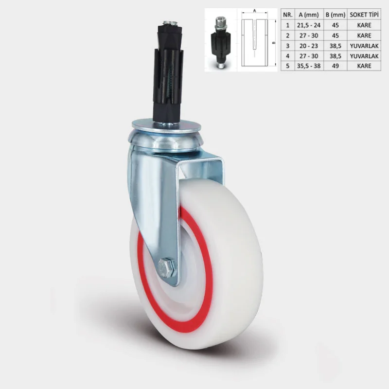 Preslenmiş çelik sac, beyaz çinko kaplama, çift bilya yataklı, döner başlık, civata ve somunlu teker aksı