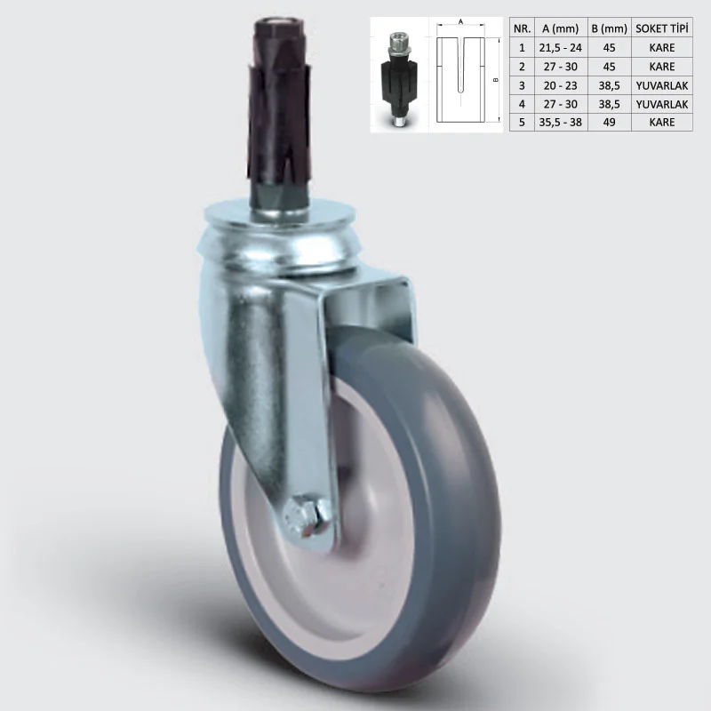 Preslenmiş çelik saç, beyaz çinko kaplama, çift bilya yataklı, döner başlık, cıvata ve somunlu teker aksı