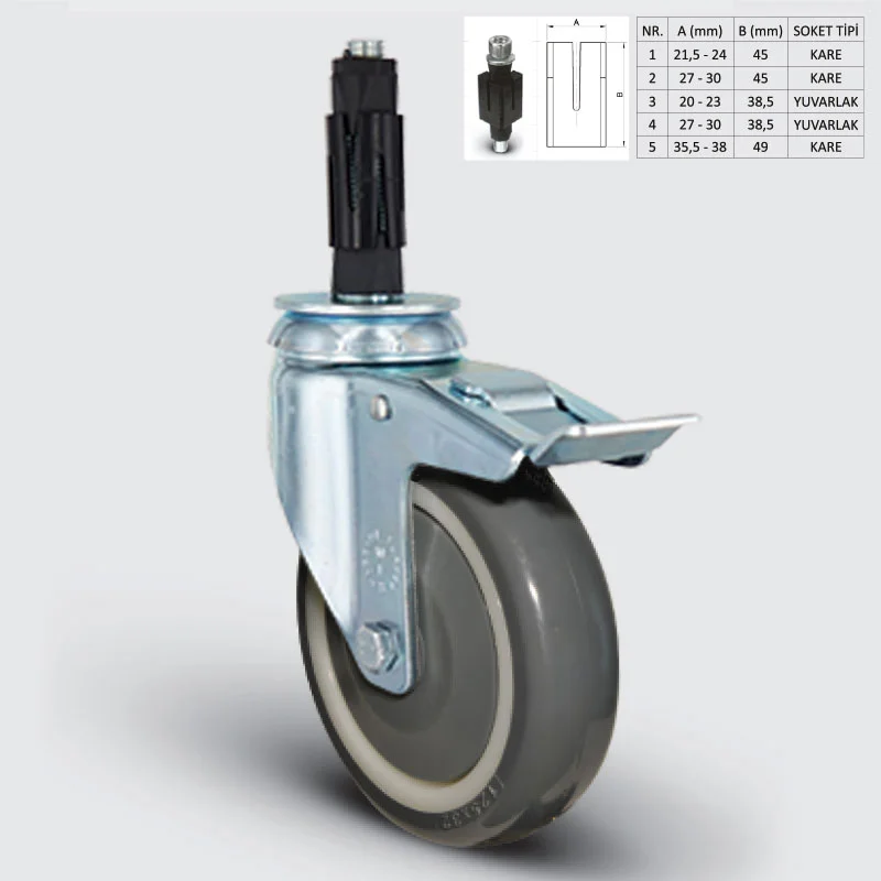 Preslenmiş çelik sac, beyaz çinko kaplama, çift bilya yataklı, döner başlık, civata ve somunlu teker aksı.