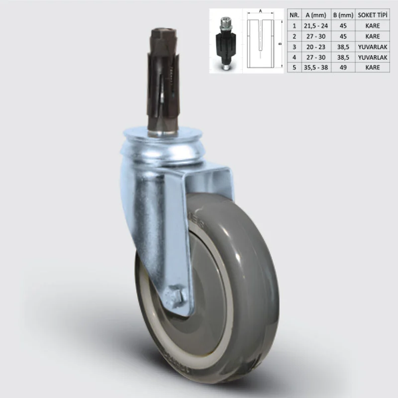 Preslenmiş çelik sac, beyaz çinko kaplama, çift bilya yataklı, döner başlık, civata ve somunlu teker aksı.