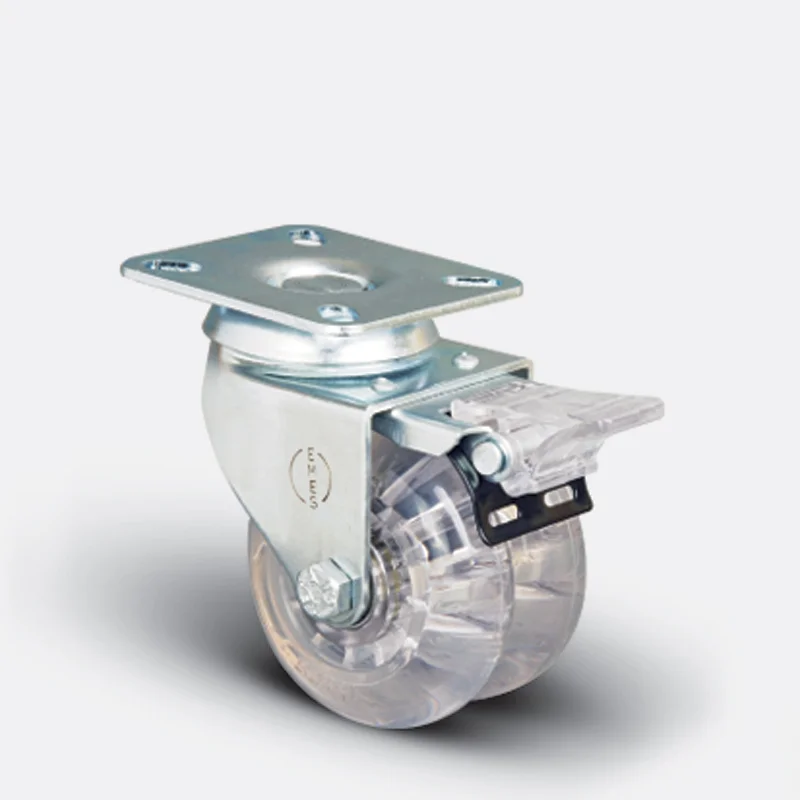 Polikarbonat kasnaklı, poliüretan kaplama ( Şeffaf ), jant kapaksız, çift teker, kendinden burçlu ve bilya rulman yataklı