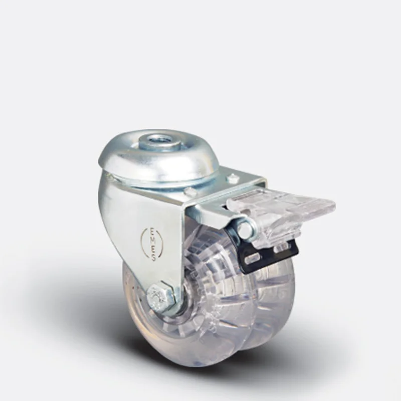 Polikarbonat kasnaklı, poliüretan kaplama ( Şeffaf ), jant kapaksız, çift teker, kendinden burçlu ve bilya rulman yataklı