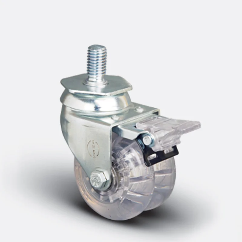 Polikarbonat kasnaklı, poliüretan kaplama ( Şeffaf ), jant kapaksız, çift teker, kendinden burçlu ve bilya rulman yataklı