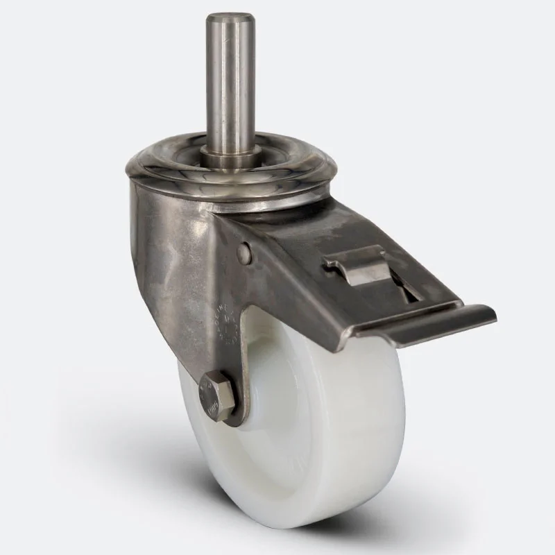 Preslenmiş paslanmaz çelik saç, çift bilya yataklı, döner başlık, metal toz koruması, cıvata ve somunlu teker aksı