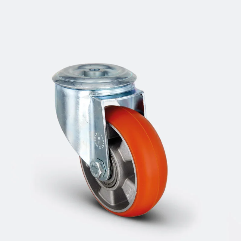 Preslenmis çelik saç, beyaz çinko kaplama, çift bilya yataklı, döner baslık, plastik toz koruması, cıvata ve somunlu teker aksı