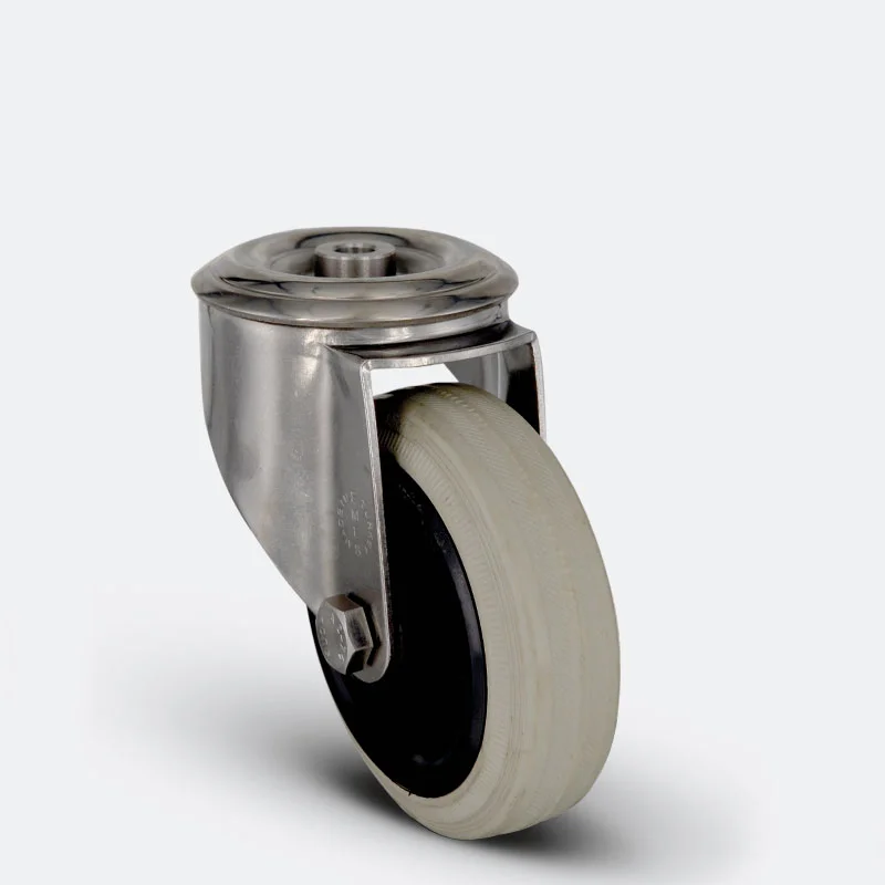 Preslenmiş paslanmaz çelik saç, çift bilya yataklı, döner başlık, metal toz koruması, cıvata ve somunlu teker aksı