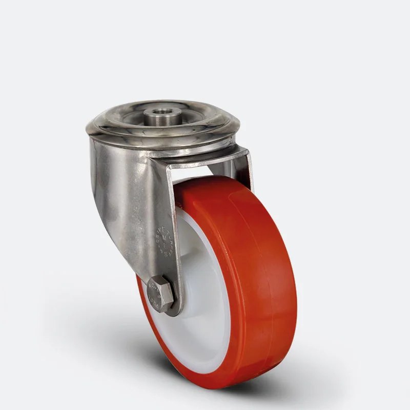 Preslenmiş paslanmaz çelik saç, çift bilya yataklı, döner başlık, metal toz koruması, cıvata ve somunlu teker aksı