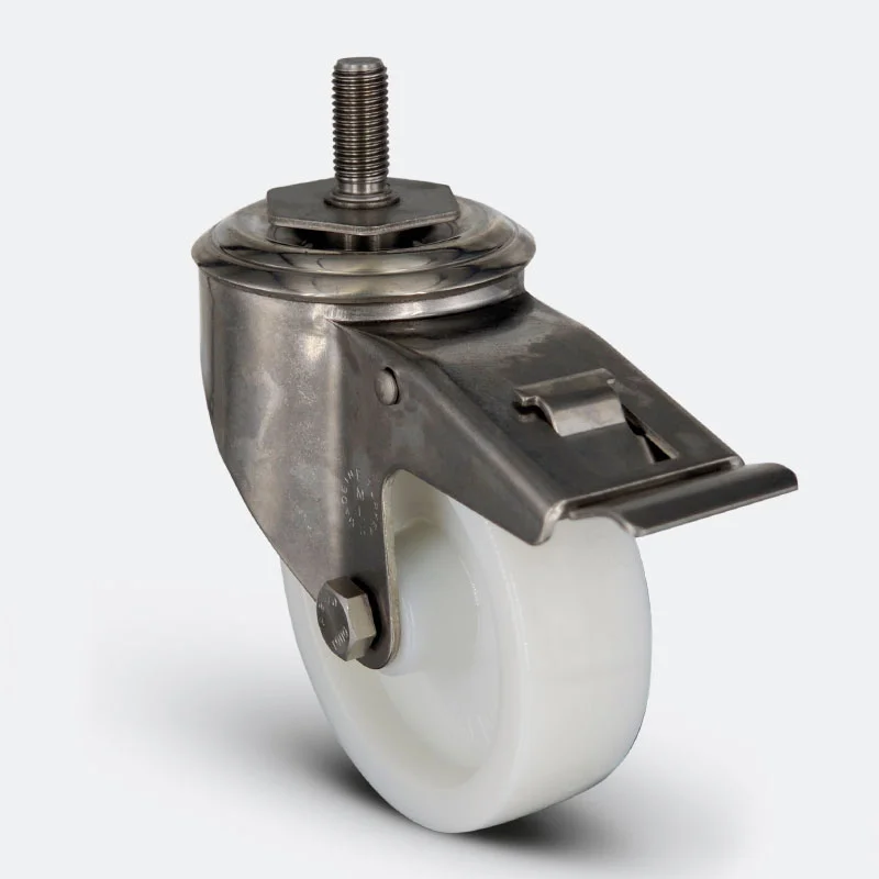 Preslenmiş paslanmaz çelik saç, çift bilya yataklı, döner başlık, metal toz koruması, cıvata ve somunlu teker aksı