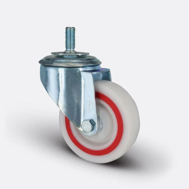 Preslenmiş çelik saç, beyaz çinko kaplama, çift bilya yataklı, döner başlık, plastik toz koruması, cıvata ve somunlu teker aksı