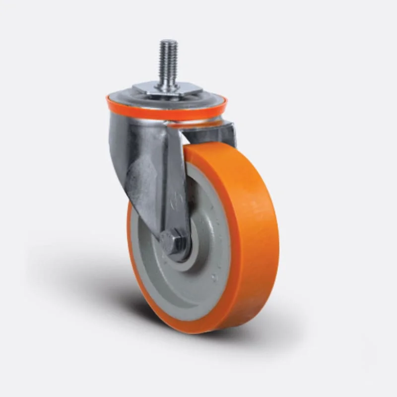 Preslenmiş çelik saç, sarı çinko kaplama, çift bilya yataklı, döner başlık, plastik toz koruması, cıvata ve somunlu teker aksı